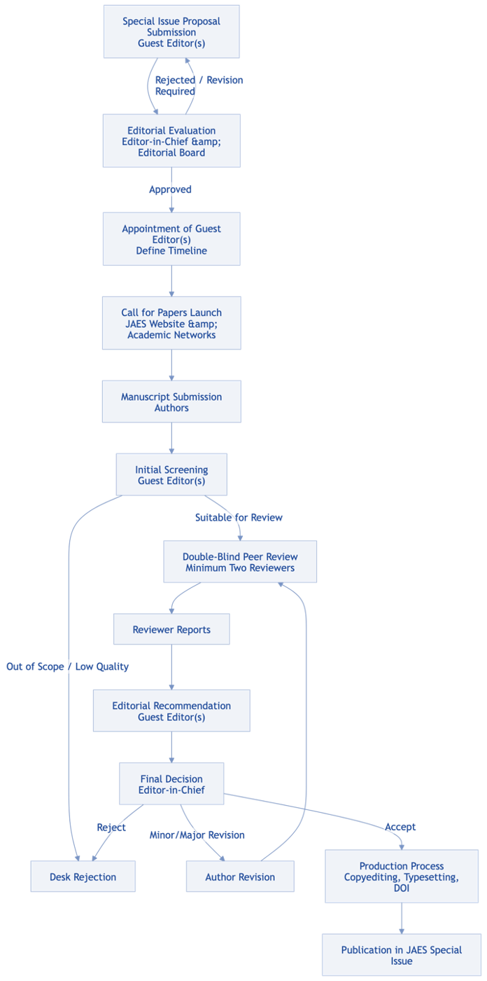For the purposes of governance and appointments, the Editorial Board of JAES consists of the Editor-in-Chief, the Managing Editor, and the Associate Editors. This body collectively exercises editorial responsibility for the journal’s academic quality, peer review integrity, and policy compliance. The International Advisory Board and the Panel of Reviewers provide consultative and reviewing functions, respectively, but do not participate in editorial decision-making or appointments.